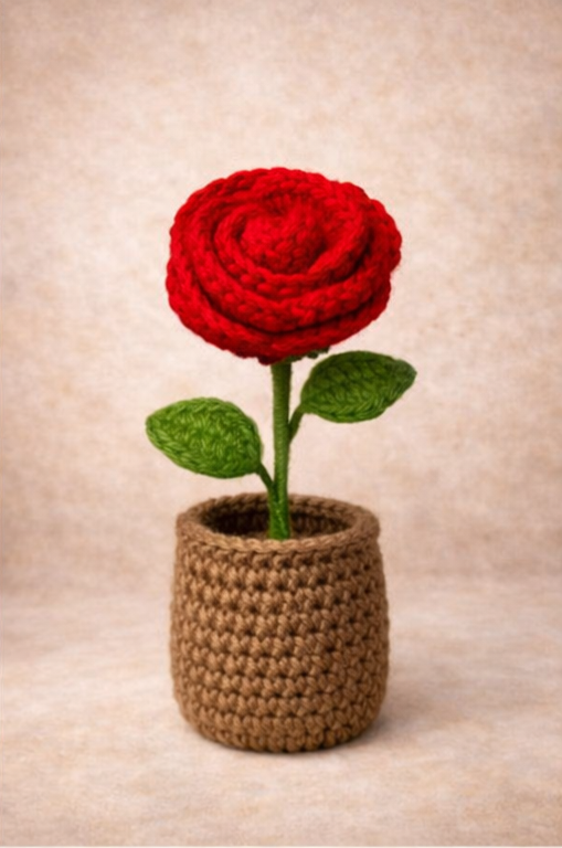 Handmade crochet rose pot — aesthetic, evergreen decor for any space.