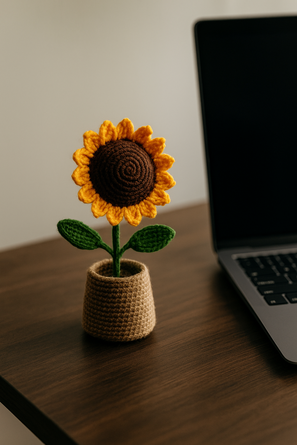 Handmade crochet sunflower pot — a warm decor piece for desks and shelves.